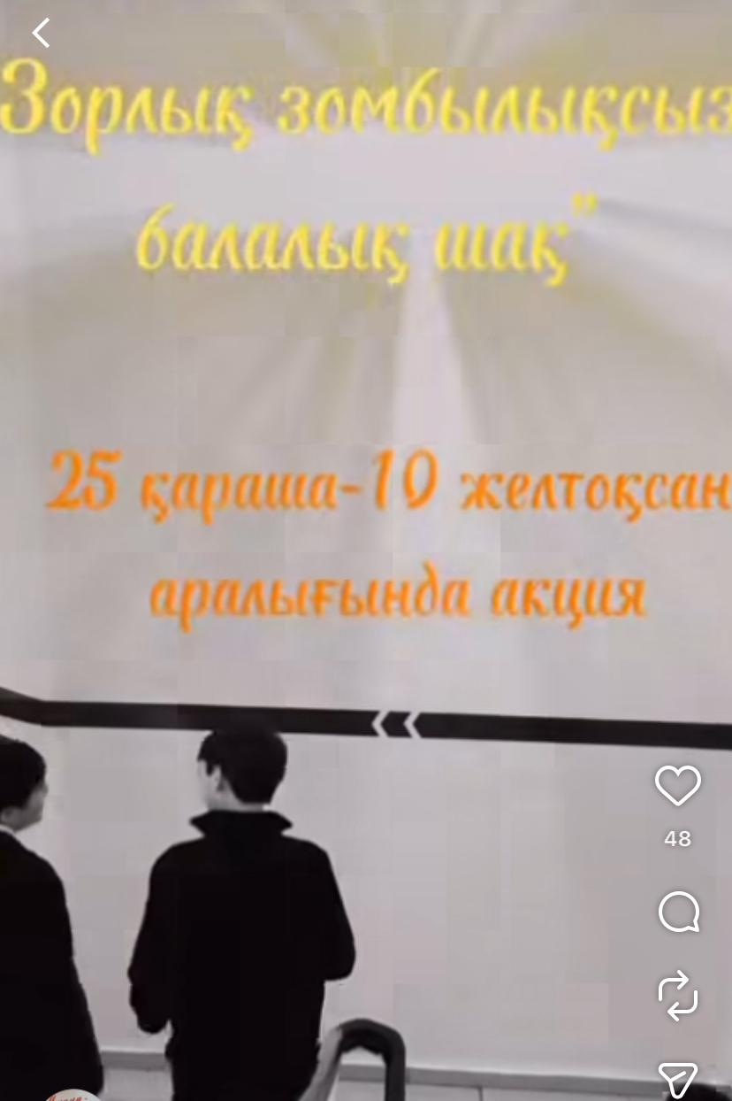 25 қараша-10 желтоқсан аралығында «Қатыгездіксіз және зорлық-зомбылықсыз балалық шақ" акциясының басталуын насихаттау мақсатында «Зорлық-зомбылықсыз балалық шақ" тақырыбында түсірілген видеоролик