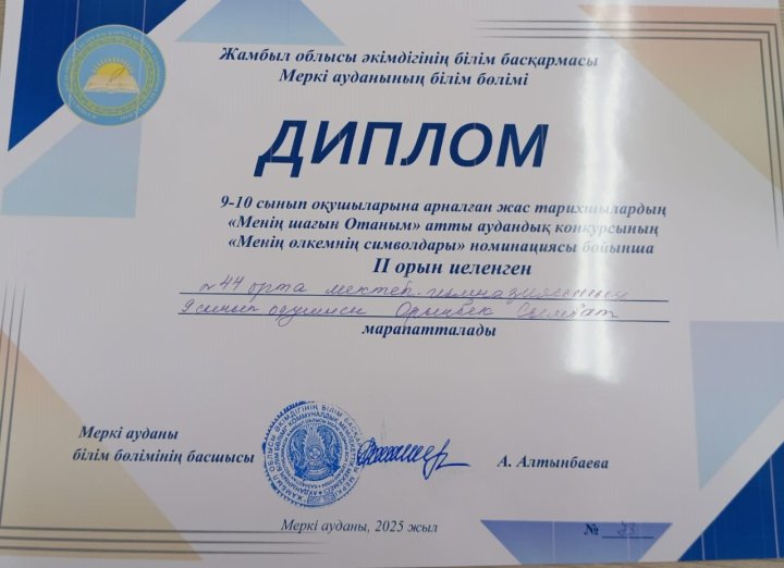 9-10 сынып оқушыларына арналған Жас тарихшылардың "Менің кіші Отаным" республикалық зияткерлік байқауының аудандық кезеңінің "Менің өлкемнің символдары" номинациясы бойынша ІІ орын иегері 9сынып оқушысы Орынбек Сымбат , жетекшісі Киер Л.Н.