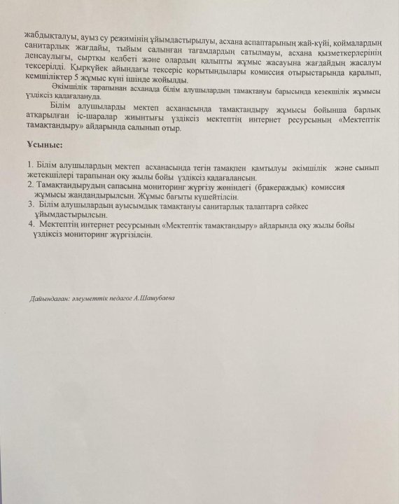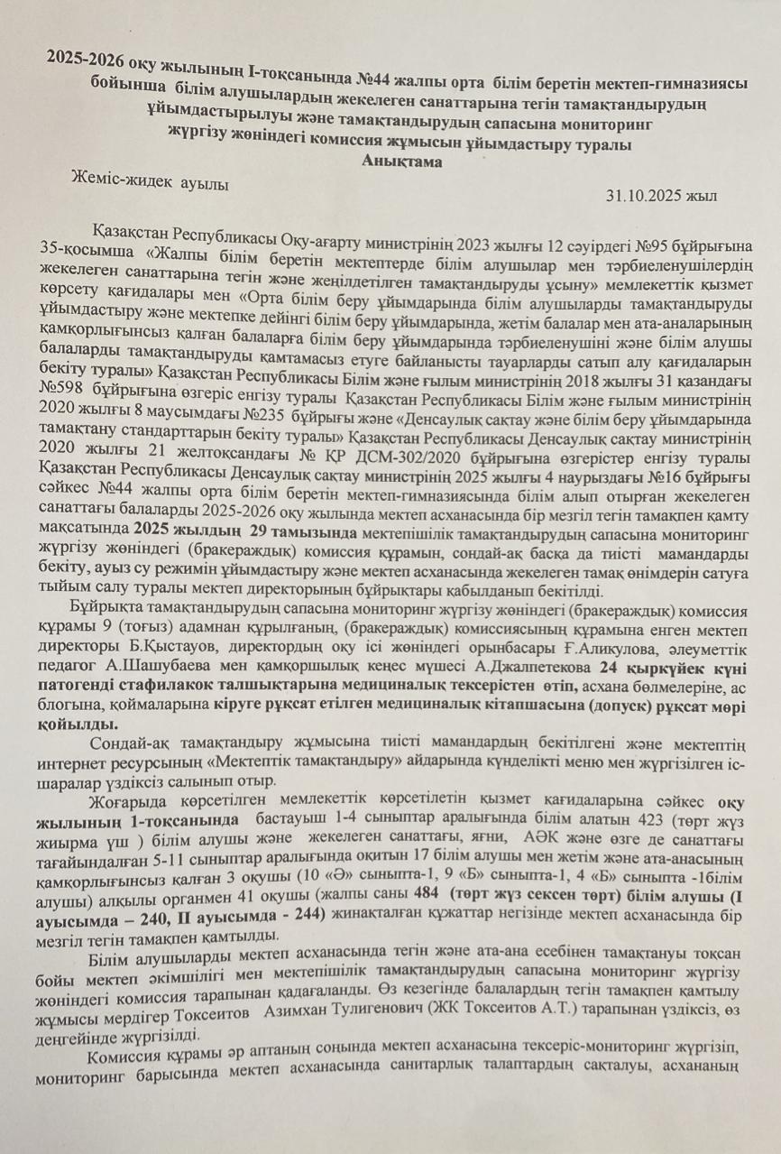 30 қазан 2025 0 1 2 3 4 5 І-тоқсандағы тамақтандырудың сапасына мониторинг жүргізу жөніндегі комиссия жұмысын ұйымдастыру